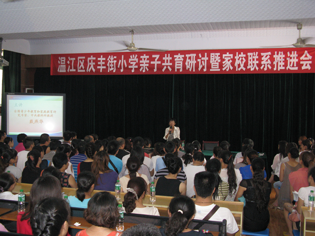 2012年9月5日,温江区庆丰街小学在学校多功能厅举行了一场别开生面的新生家长会。家长会邀请了全国知名青少年教育、家庭教育专家、中央教科所戴燕华教授作专题讲座,280余名一年级新生家长参加了此次活动。