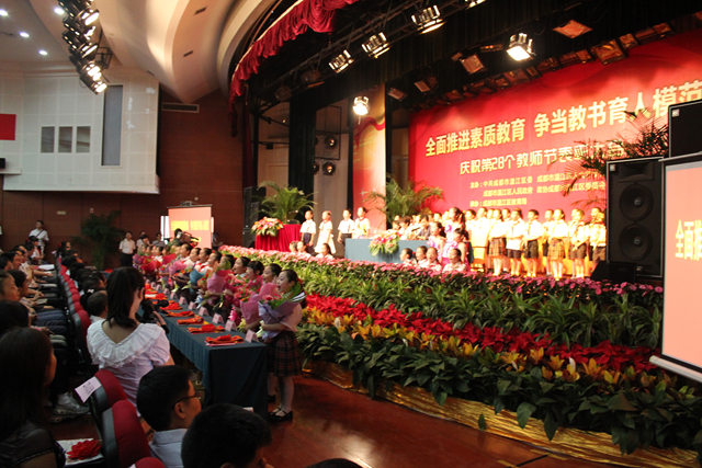 9月10日,第28个教师节表彰活动在温江梦想剧场隆重举行。温江区委、区政协、区人大、区教育局等政府部门主持会议。在高规格的表彰大会场,116名手捧鲜花,身着洁白的礼仪校服,系着鲜艳红领巾环立在会场周围的庆丰街小学少先队员成为会场上一道靓丽的风景。