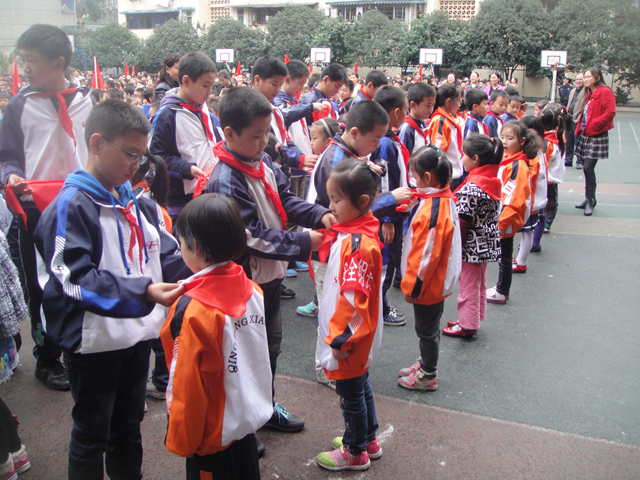 活动中,一年级共有274名新队员加入了中国少年先锋队,在大队辅导员的带领下,274名新队员举起了右手,紧握拳面向队旗庄严宣誓。还有35名老师被聘为中队辅导员,由少先队员代表为辅导员们戴上了鲜艳的红领巾,共有500名同学分别被任命为新一届的大队委、中队长、小队长。