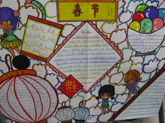 为了弘扬民族传统精神,铭记我们自己的节日。春节期间,同学们积极制作了以“春节”或“元宵节”为主题的节日小报。同学们通过网络搜索、查阅书籍、请教老师及家长、学生互动等方式,在小报里配上图画和对传统文化的感知记录,从版式设计、内容采编、表现形式上充分展示自身特长、喜好。