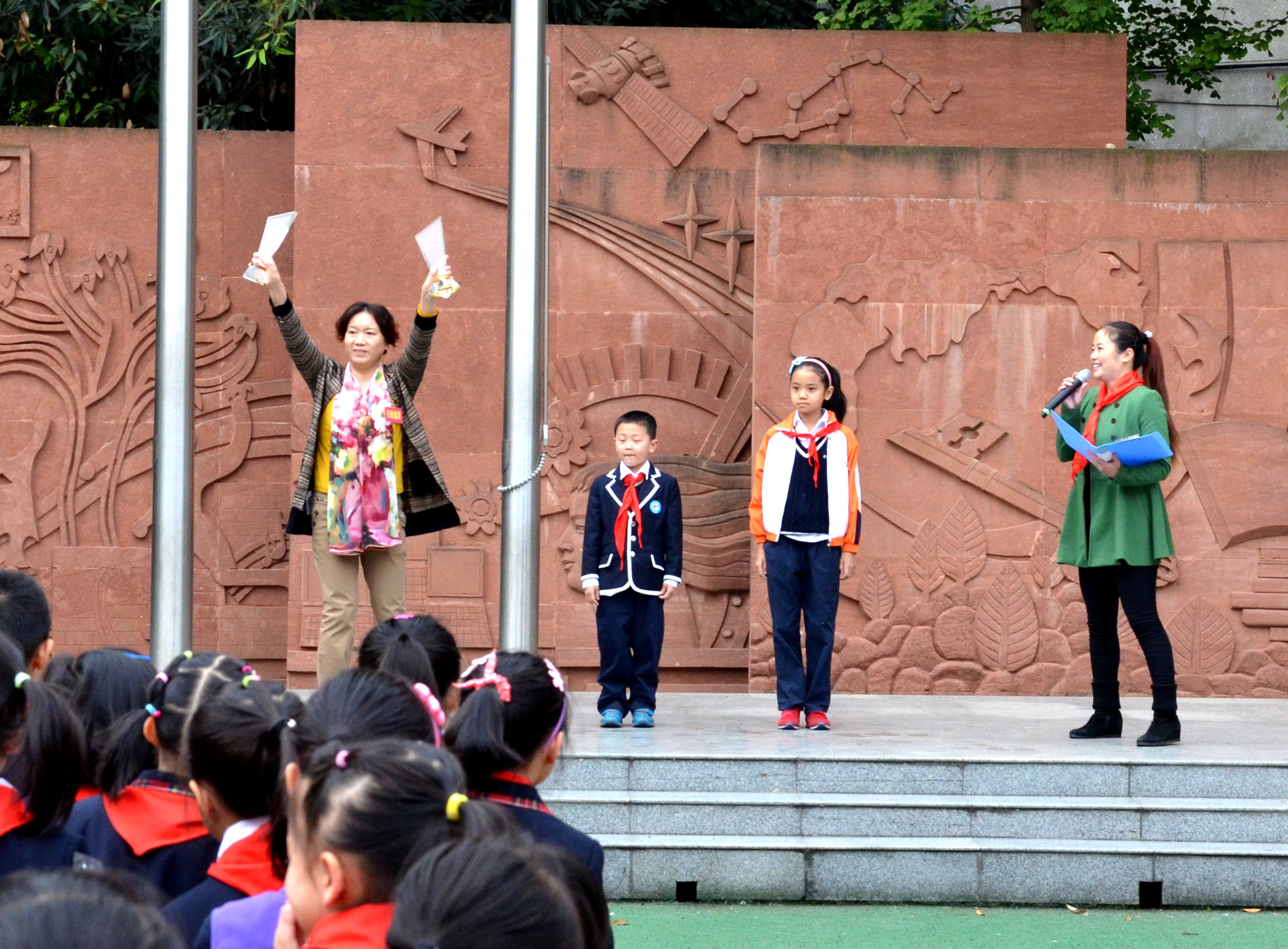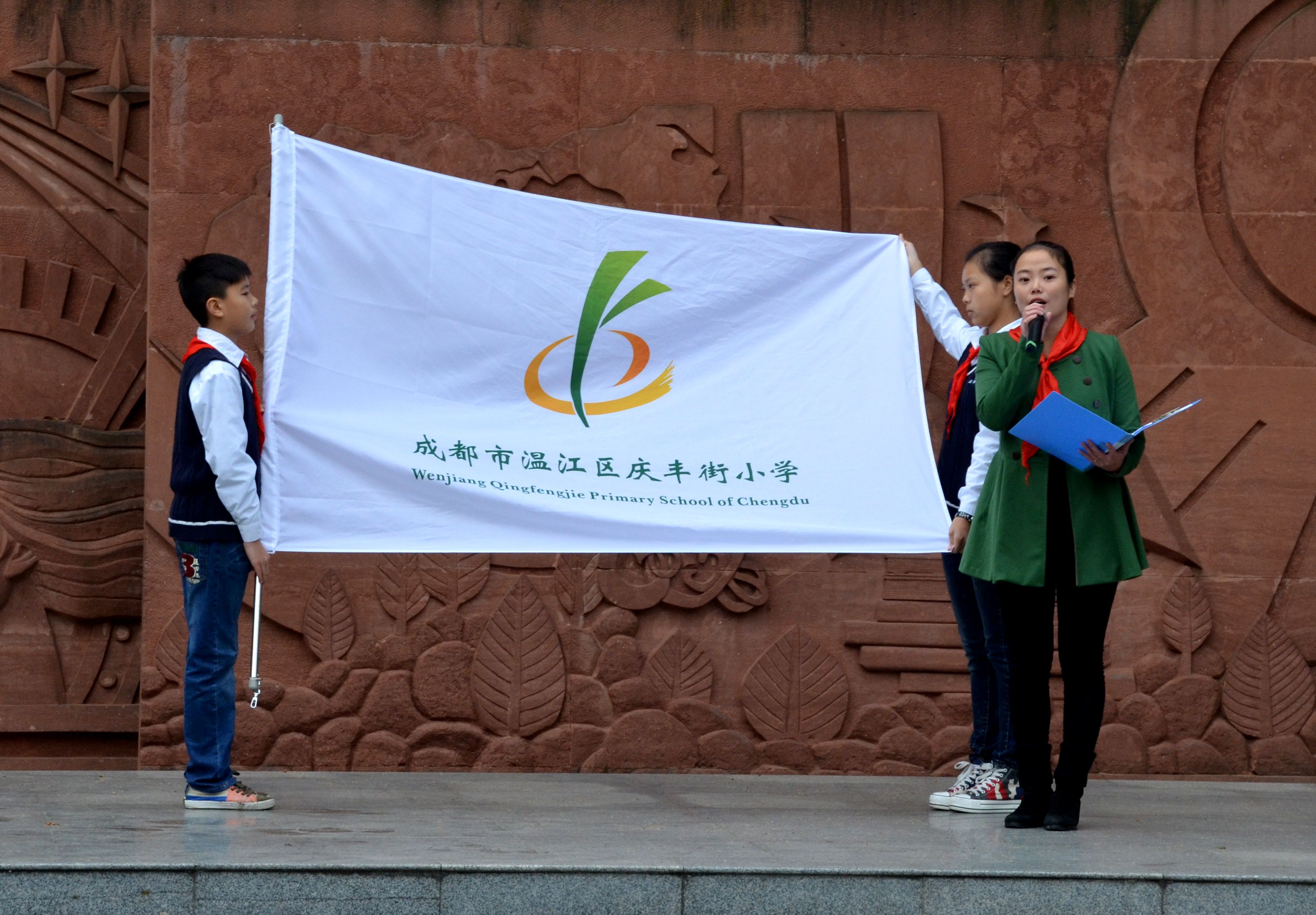 2014年11月3日,温江区庆丰街小学升旗仪式上升起了庆丰街小学百年来第一面校旗。温江区庆丰街小学校长刘秀荣亲自为校旗设计荣获特等奖的两名学生:原6.1班学生张思行、现5.1班学生白昕玥颁发了特等奖纪念杯。
