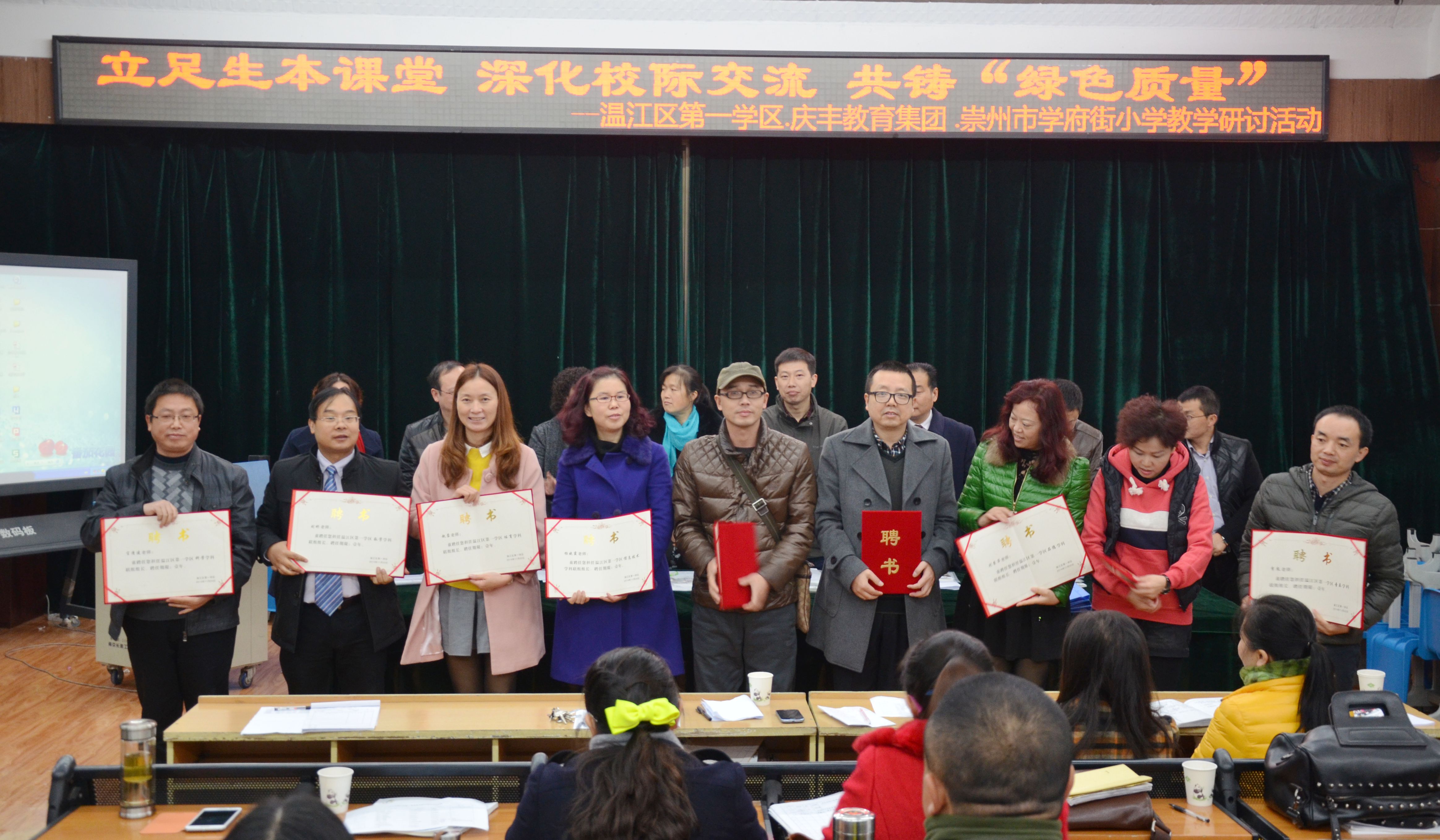 1 0:35,在学区长罗静玉校长的主持下,举行了“温江区第一学区 学区联组成立及联组长聘书发放仪式。”邓忠文、刘彬、徐秋、刘素萍、王攀科、赵蓉、杨晓霞、官清建、李胤等九位骨干教师接过了学区各学科联组长聘书并签订了目标责任书。