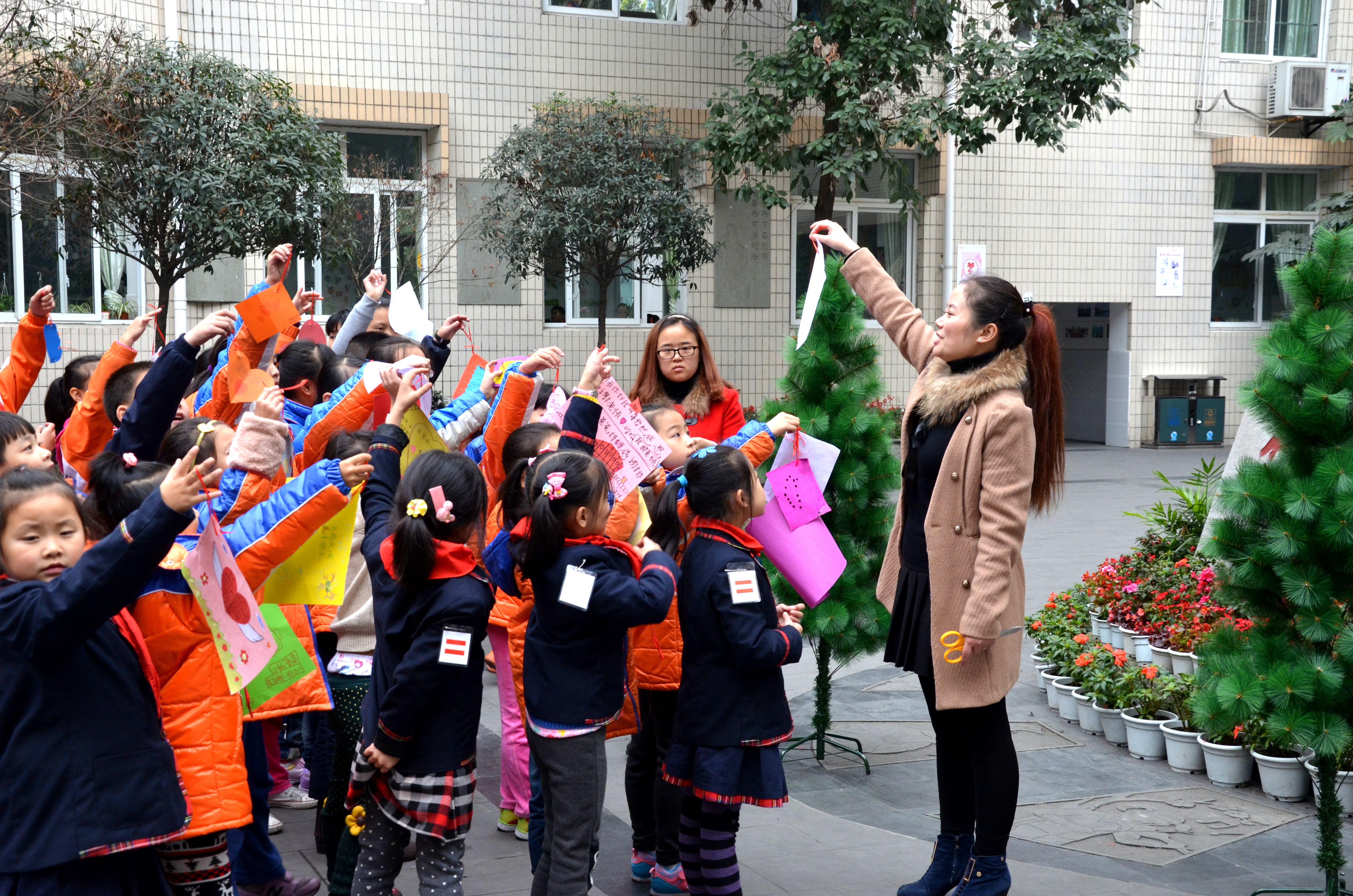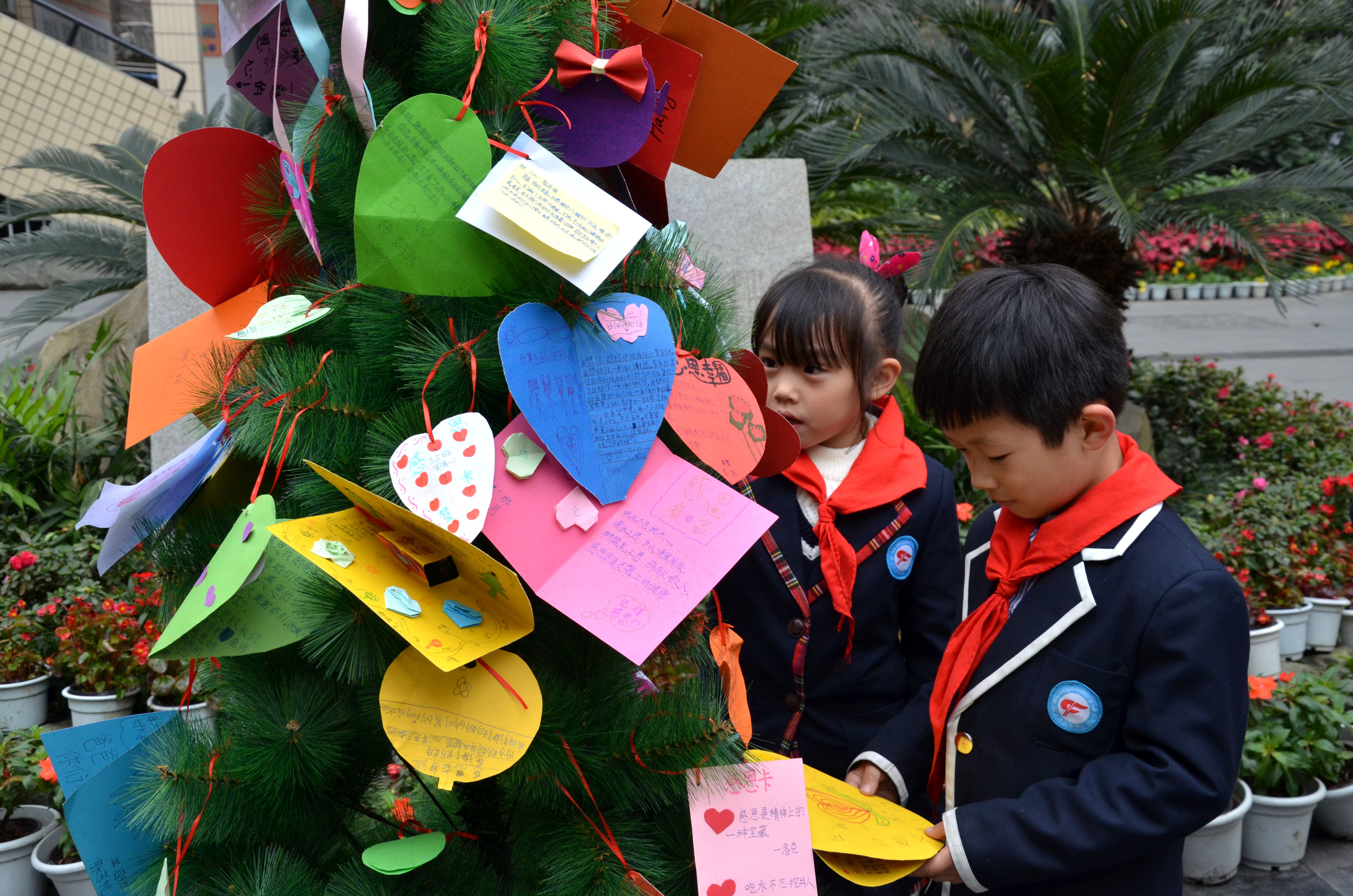 上周星期四班会课各班还开展了以感恩教育为主题的班会活动。在活动中,孩子们了解了感恩的对象,并制作了感恩卡。班会课结束以后,各班选了两名学生代表把感恩卡挂在了中操场的感恩树上。