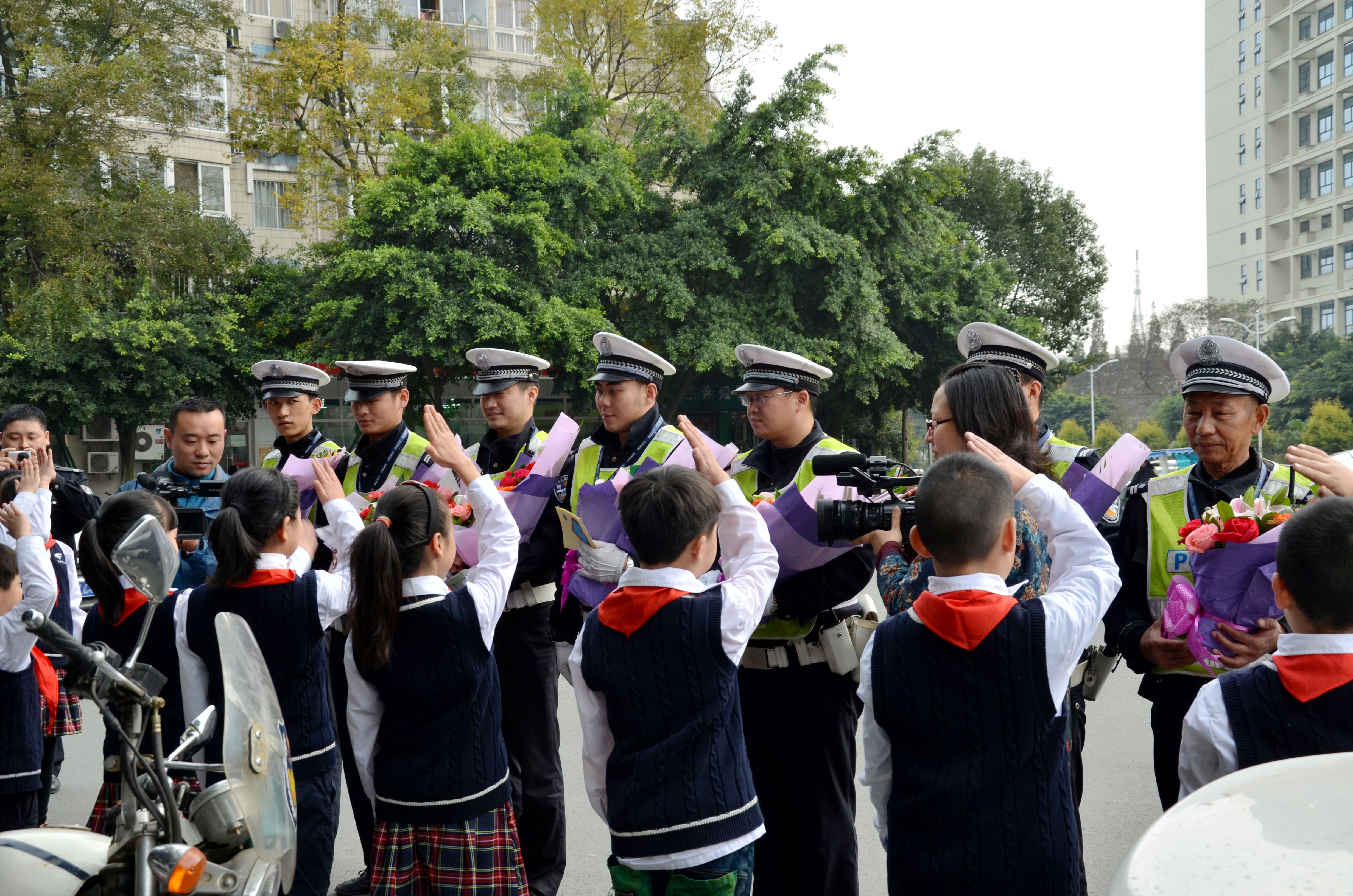 来到学校门口的十字路口,五年级的学生代表张俊阳等同学快步上前,给正在岗位上工作的交警叔叔们献上鲜花,敬上一个标准的队礼:“感谢叔叔们的辛勤劳动,为社会创造一个和谐安宁的交通环境!”交警叔叔们还以一个个庄严的军礼!他们的行为说明了一切。