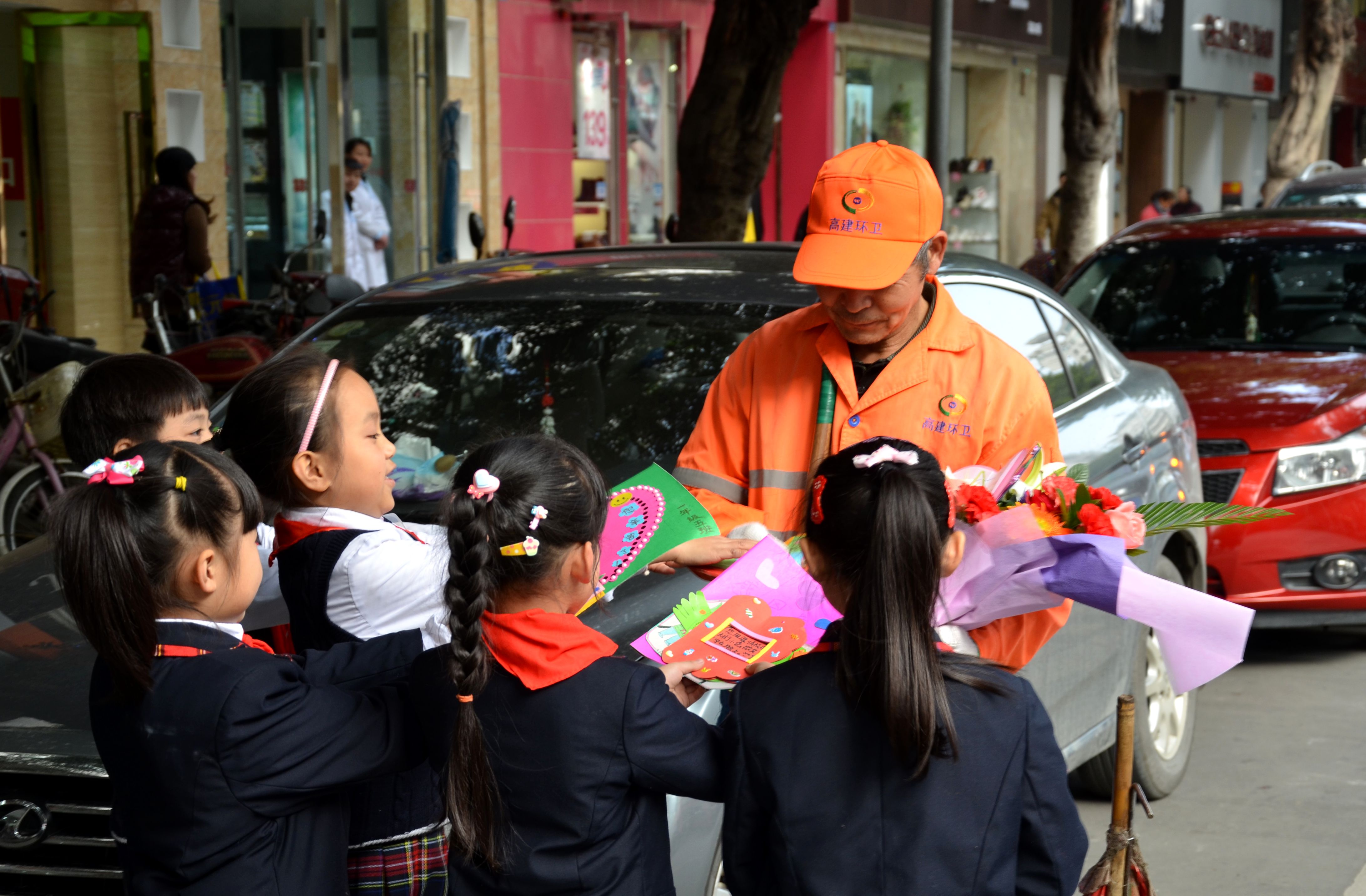 来到学校门口的庆丰街, 一年级学生代表黄敬淇等小朋友微笑着对正在工作岗位上劳作的环卫工人说:“爷爷,今天是感恩节,谢谢您给我们带来这么美丽的城市环境,谢谢您!”环卫老爷爷激动地接过鲜花,嘴里不停地说:“谢谢你们,乖孩子!”