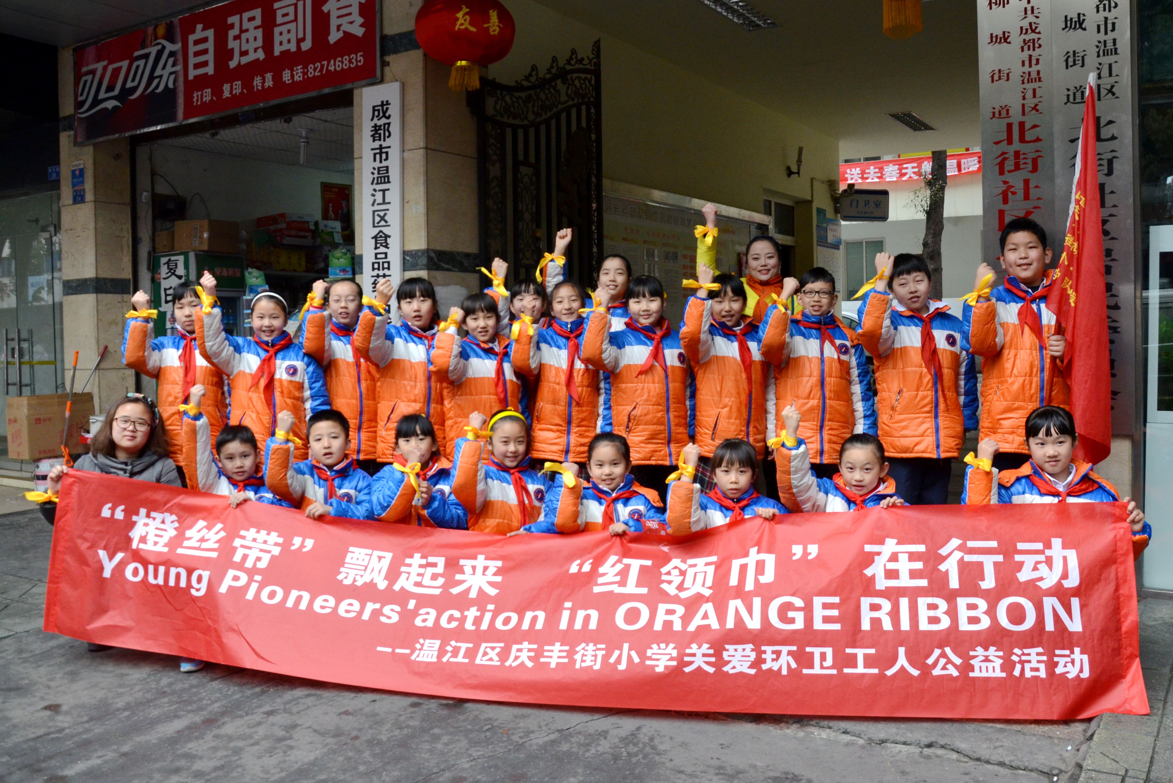 离开社区,孩子们走上街道。响应温江区区委宣传部、区市容环卫局、区精神文明建设办公室的倡议,温江区庆丰街小学积极加入温江区旨在关注改善环卫工人工作条件,为“城市美容师”提供力所能及帮助的“橙丝带”关爱环卫工人公益行动。