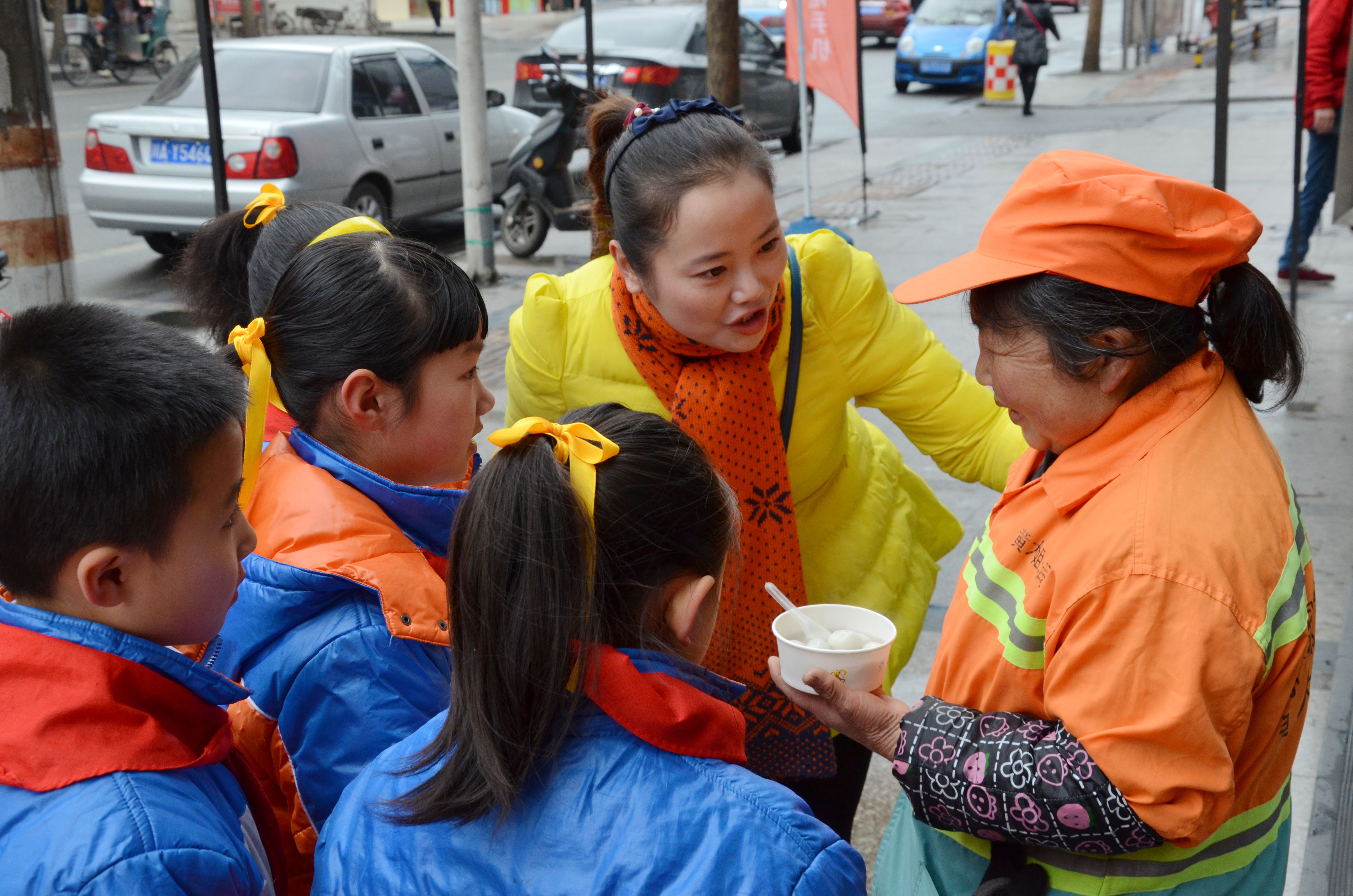 当孩子们把一碗碗热气腾腾的爱心元宵递到环卫工人手里,并对他们表示节日的问候的时候,环卫工人们无不感到特别的温暖和贴心,一股关爱的热流流遍了他们的全身,激励着他们把城市环境打扮得更美好。