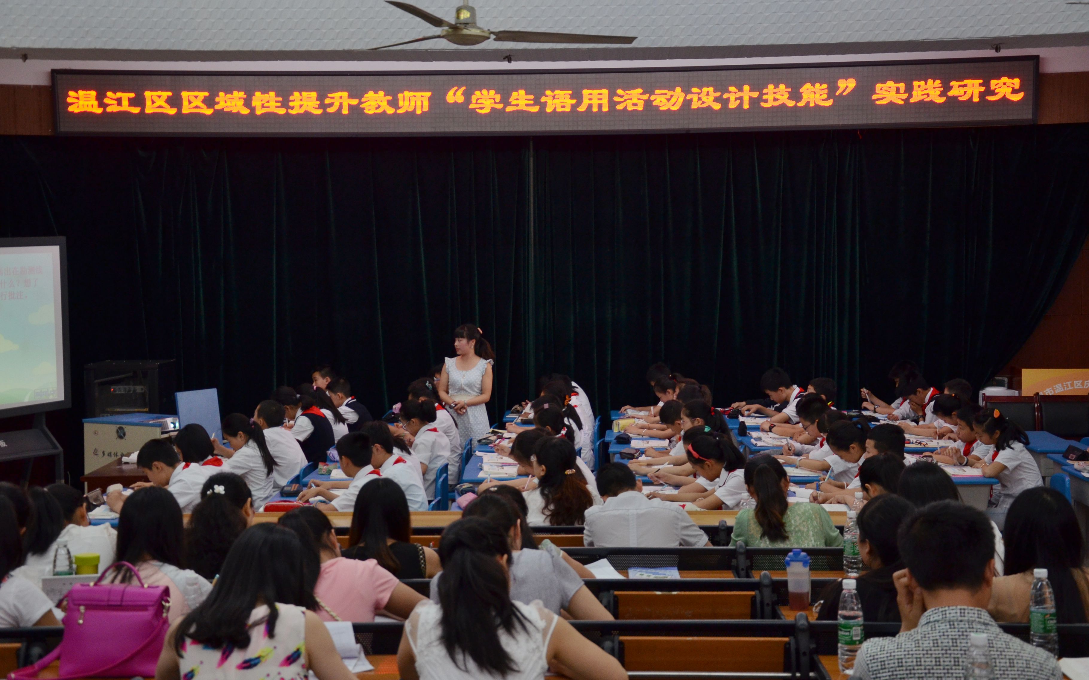 2015年5月14日上午8:30,温江区小学高段语文关于“学生语用活动设计技能实践研究”活动在庆丰街小学多功能厅举行,参加此次研究活动的有研培中心卓琼老师及全区各小学高段语文教师。