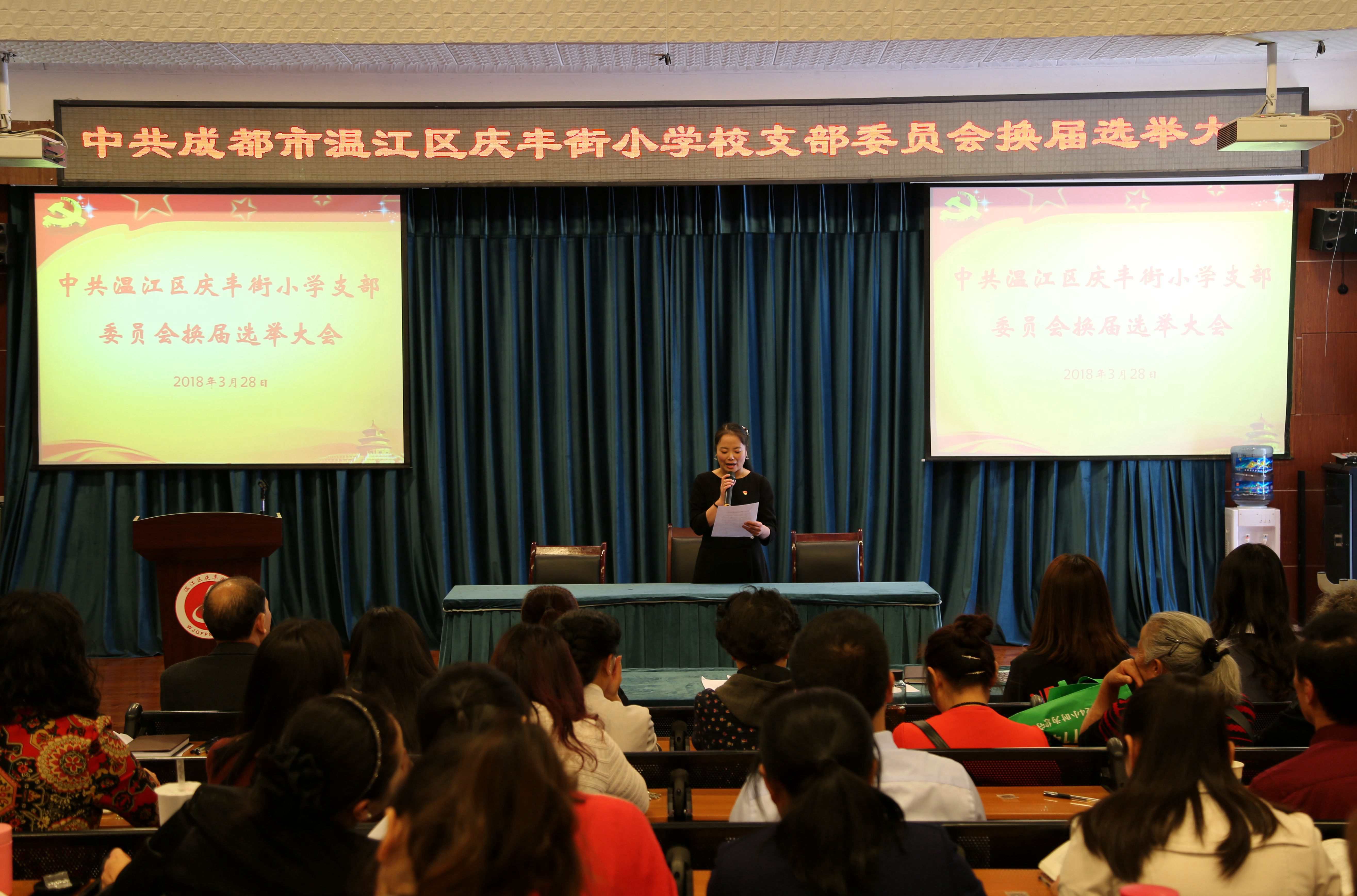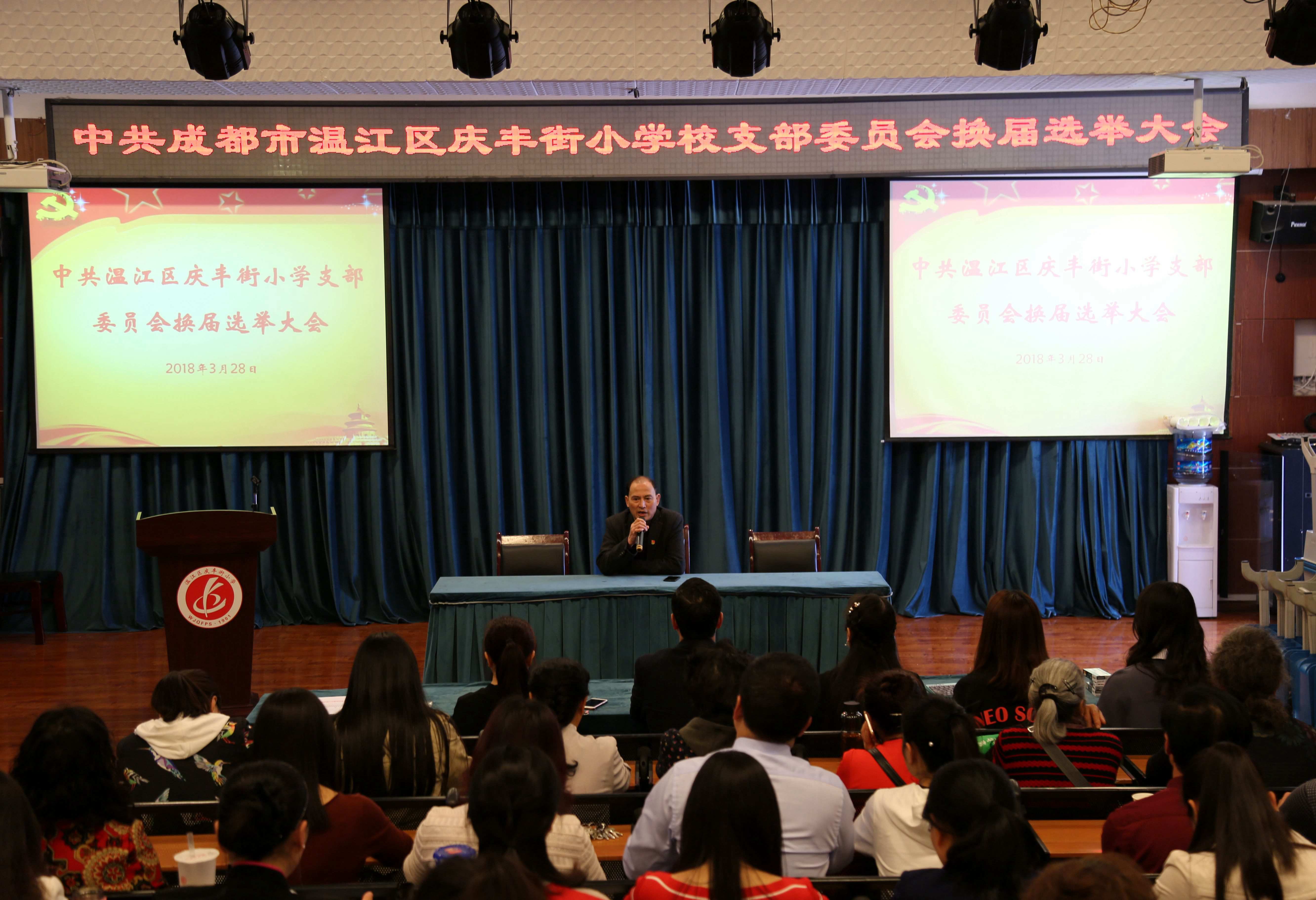 2018年3月28日,温江区庆丰街小学党支部召开换届选举大会。庆丰街小学支部书记彭邦志主持大会。支部40位党员同志准时参会。经过党章规定议程,新一届庆丰街小学党支部顺利产生:黄金强同志当选为庆丰街小学支部书记,方万强同志、袁丽同志当选为支部委员。