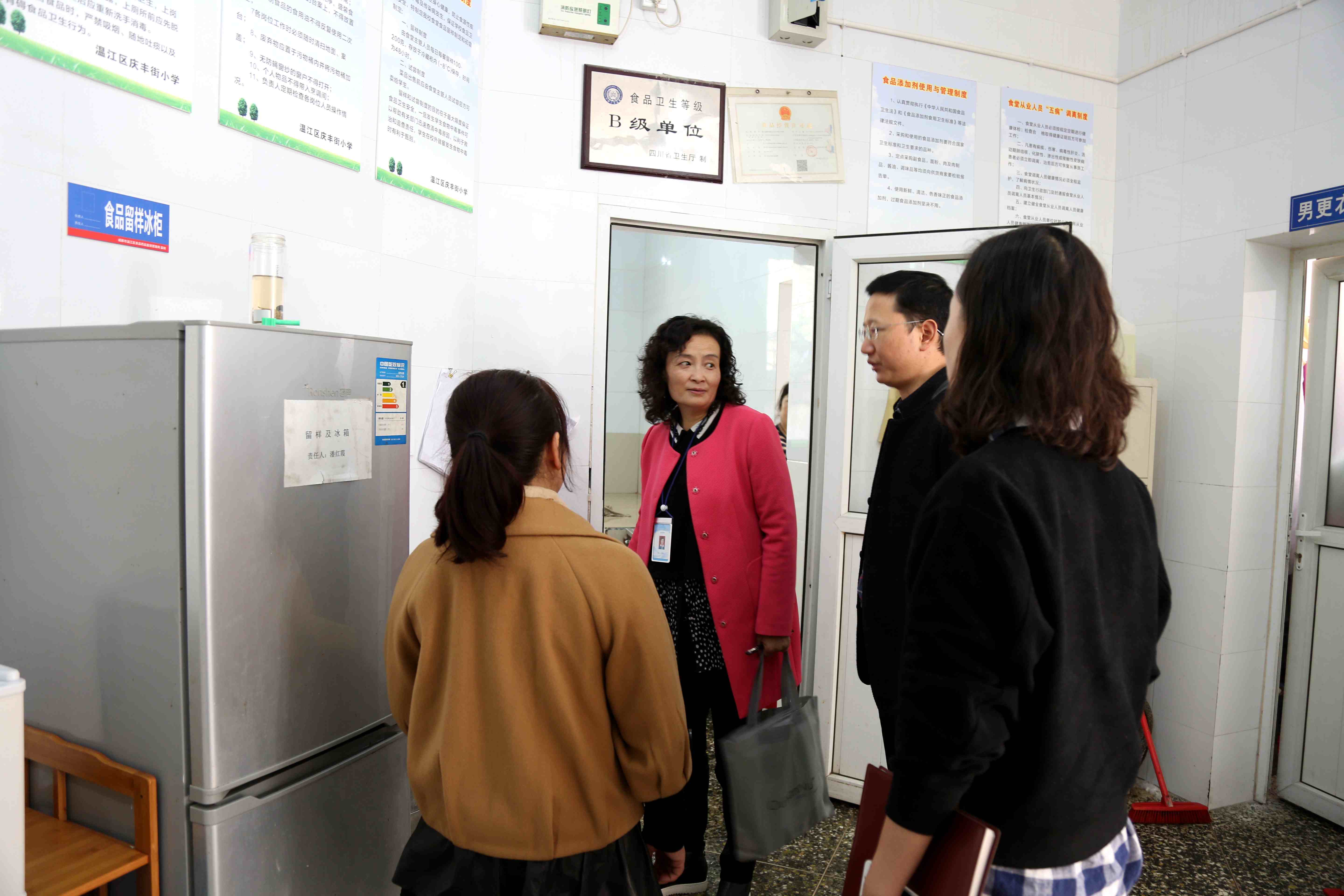 罗静玉督学还随着迎检路线走进食堂,查看食堂人员的工作情况,并仔细查阅了食堂的各项制度与记录。最后,罗督学来到了门卫,对门卫工作进行了进一步的指导,指出了每一次的安全设施检查一定要有记录、有落实,要形成闭环式管理。