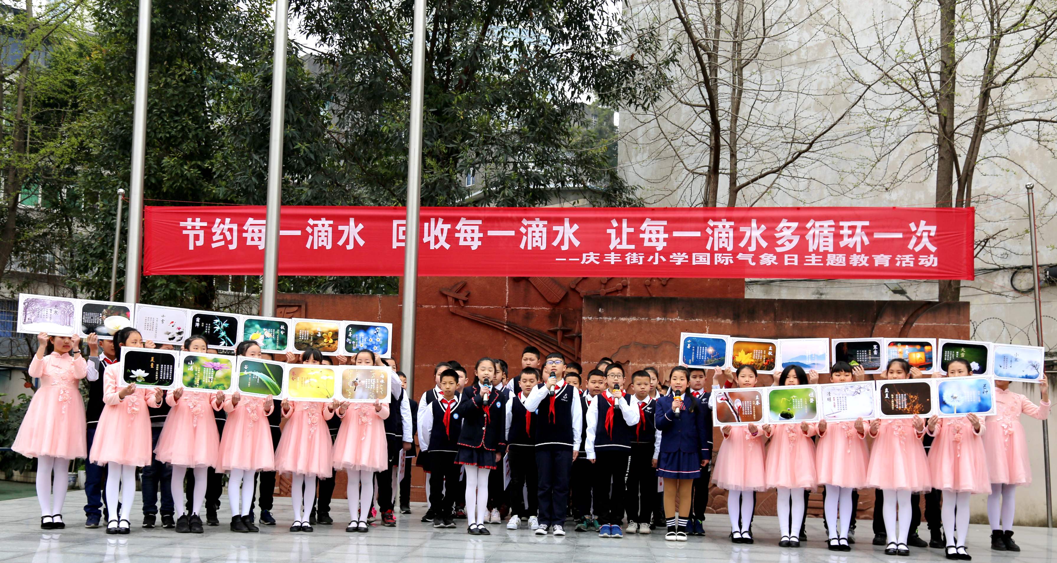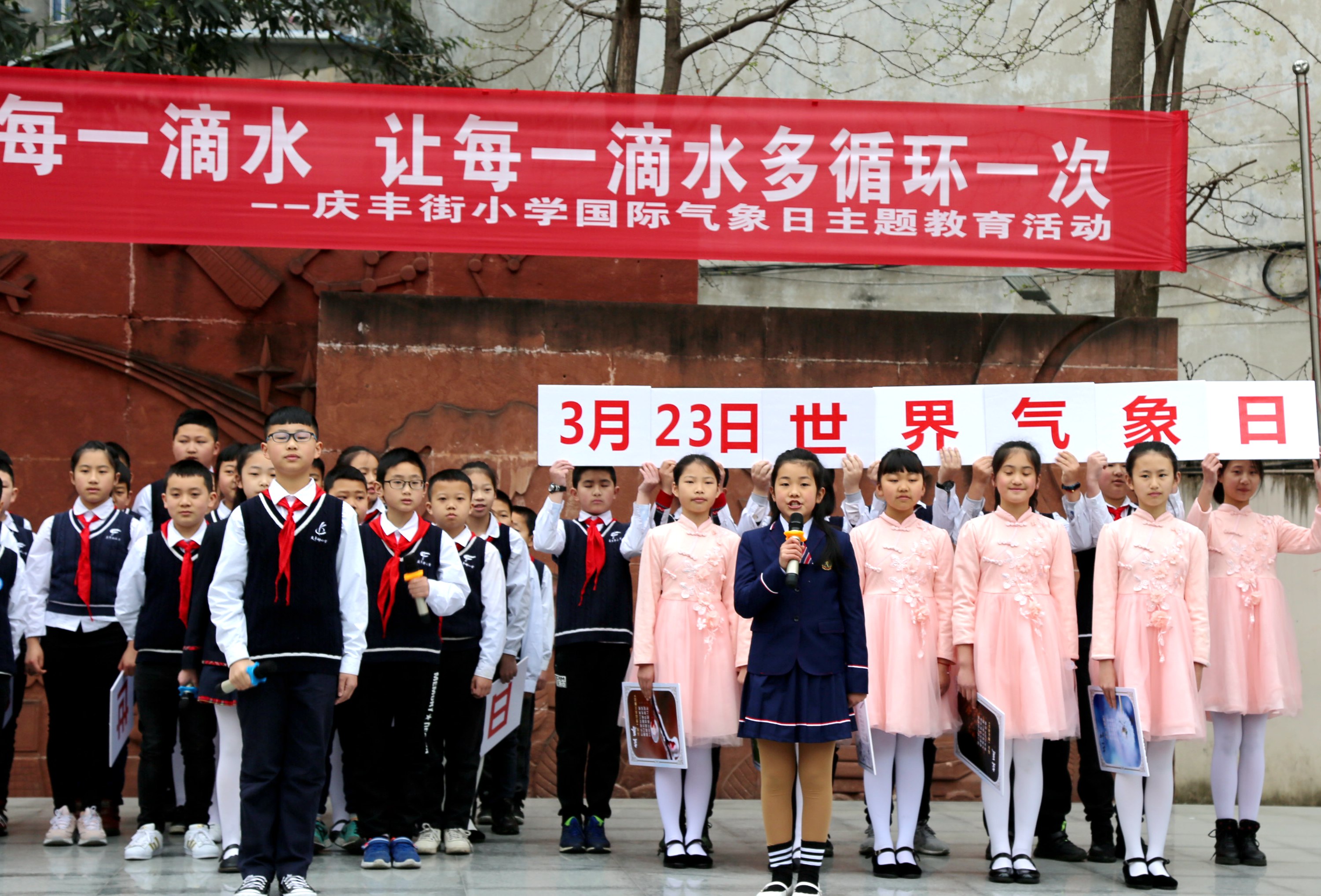 2019 年 3 月 22 日是第二十七届“世界水日”,3 月 22-28 日是第三十二届“中国水周”。2019年3月25日早上,温江区庆丰街小学的升旗仪式上,全校两千多名师生齐聚后操场,五年级一班51名同学展示了以“节约每一滴水 回收每一滴水 让每一滴水多循环一次”为主题的班级风采。