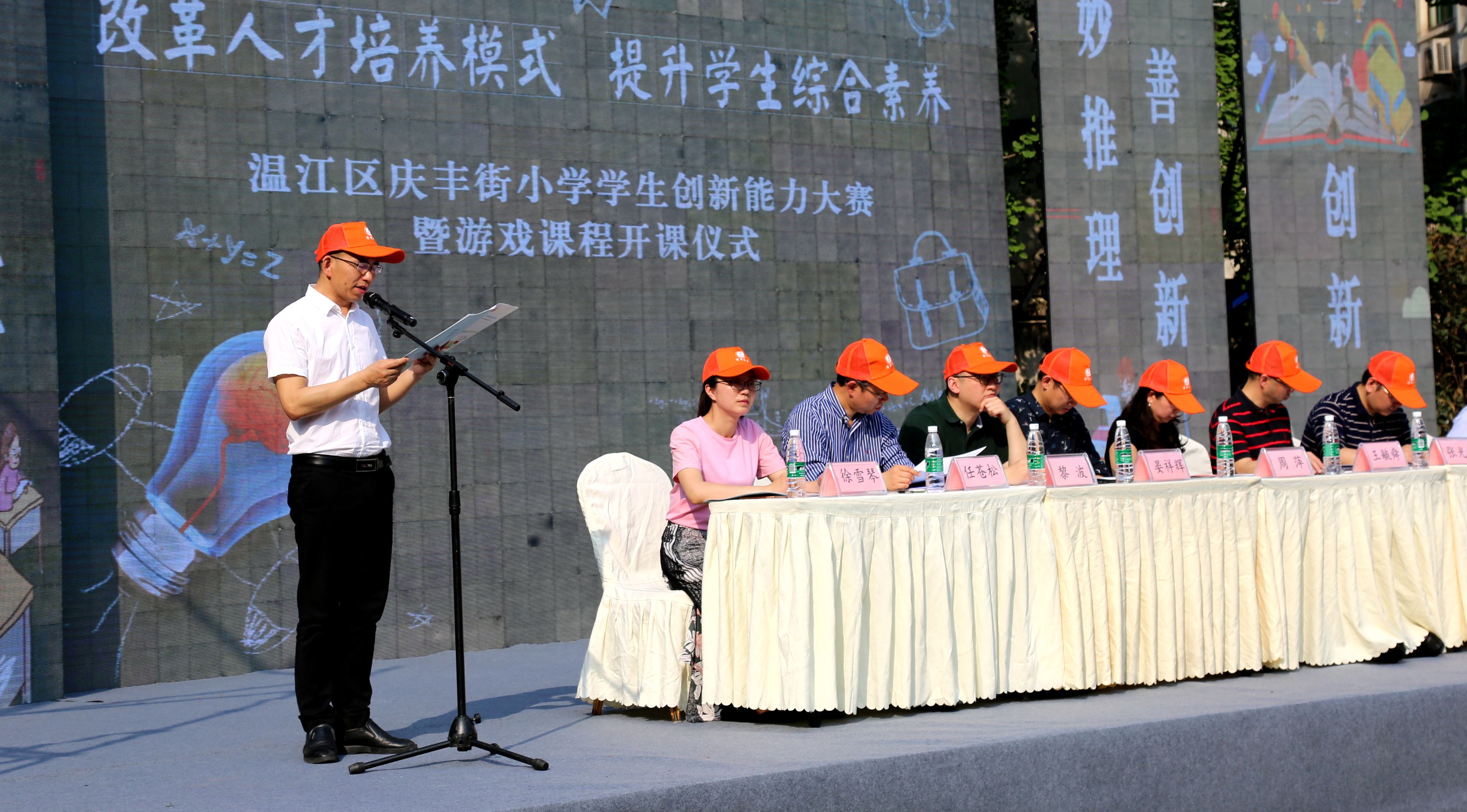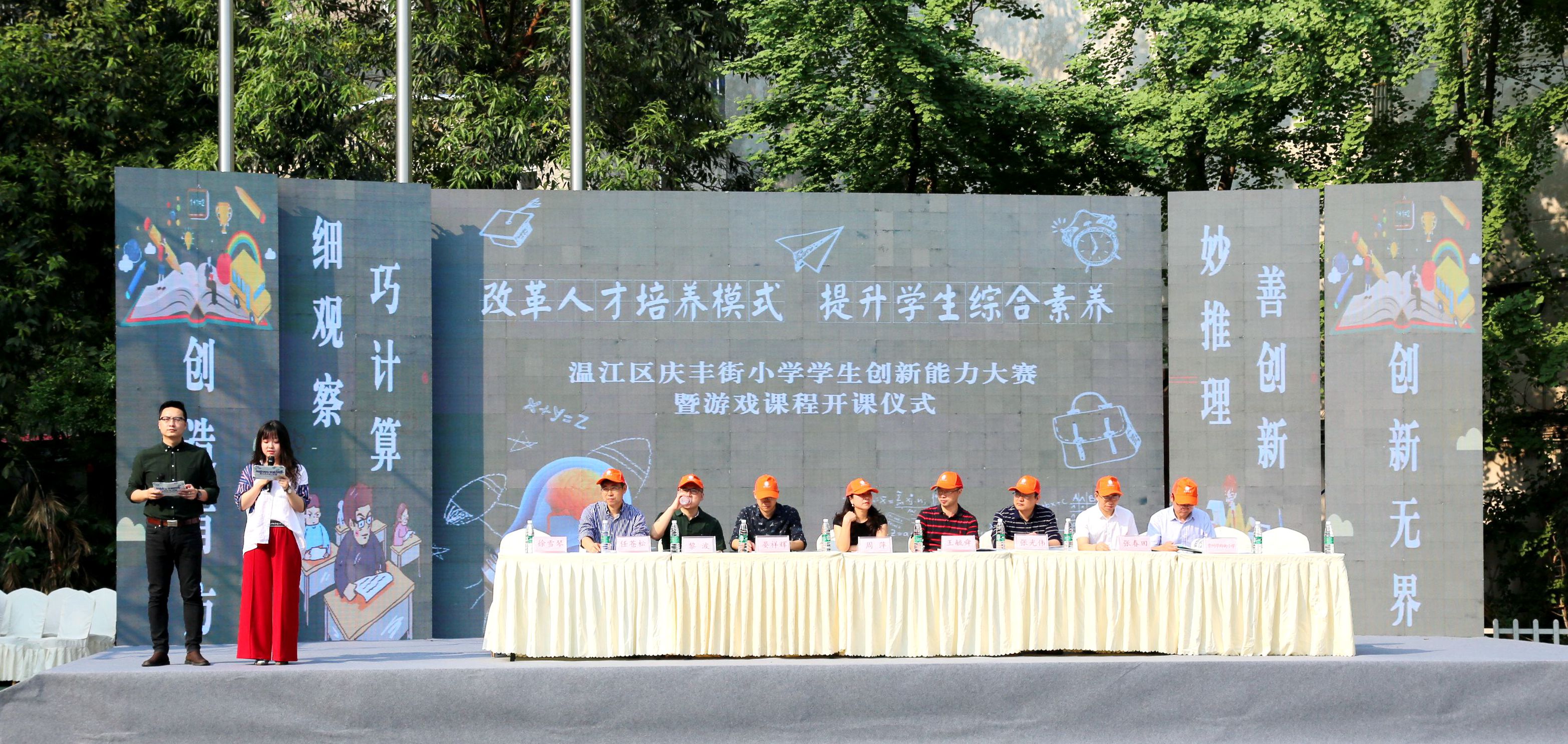 2019年4月25日,温江区庆丰街小学“改革人才培养模式 提升学生综合素养”学生创新能力大赛暨游戏课程开课仪式在庆丰街小学隆重举行。成都市温江区教育局党组成员、副局长周萍,温江区教师研究培训中心主任王毓舜参加了本次活动。教育部“国培计划”小学数学学科首席专家、成都师范学院副教授黎波、省团委少年部副部长、成都师范学院副教授晏祥辉博士、温江区名教师、温江中学数学高级教师任苍松、庆丰街小学教导主任数学教师徐雪琴作为特邀嘉宾参与活动。来至广东省云浮市的47位学校校长、圈层友好学校崇州市学府街小学、温江区第一学区学校代表以及数百位学生家长、学生共同参加了本次活动。