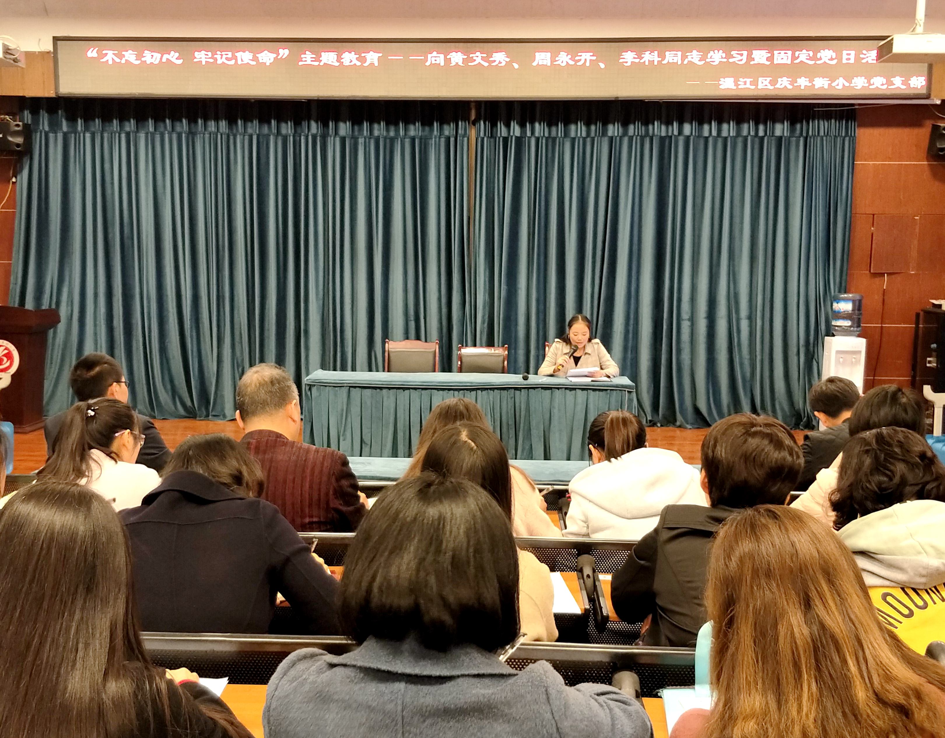 2019年11月1日下午,庆丰街小学党支部开展了“不忘初心,牢记使命”主题教育——向黄文秀、周永开、李科同志学习暨固定党日活动,全体党员同志参与此次学习。