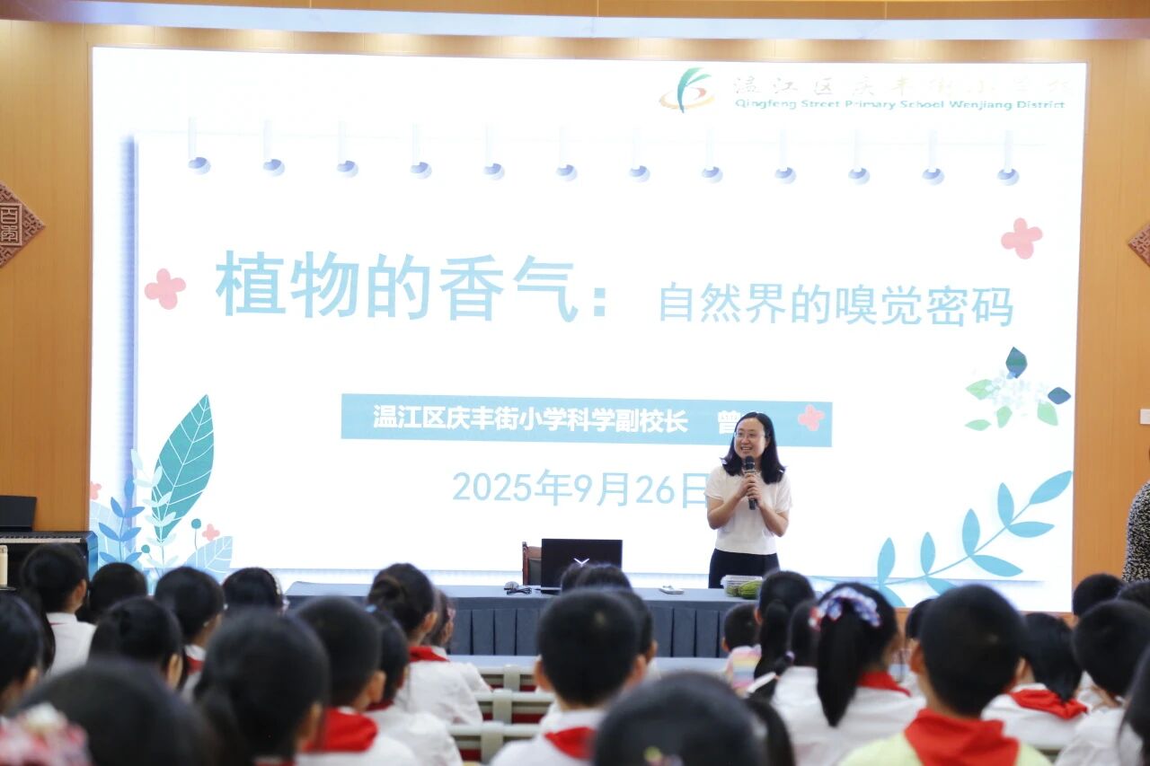 课堂上,曾院长详细解释了人类感知香气的科学原理:植物含有的挥发性芳香物质(VOCs)扩散到空气中,进入我们的鼻腔,与嗅觉受体细胞结合后产生神经信号,传输到大脑中枢神经系统,最终被识别为某种特定香气。“这就好比植物有自己的‘身份证号码’,每种植物都有其独特的‘化学指纹’。”曾院长用孩子们熟悉的比喻解释着复杂的科学概念。