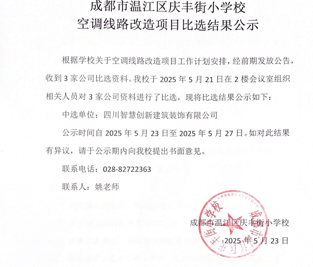 根据学校关于空调线路改造项目工作计划安排,经前期发放公告,收到3家公司比选资料。我校于2025年5月21日在2楼会议室组织相关人员对3家公司资料进行了比选,现将比选结果公示如下: