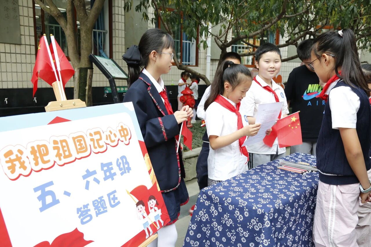 9月30日,校级自由竞答将活动推向高潮。学校别出心裁地在前操场和中操场分设竞答点,并针对不同年段学生的认知特点设置了梯度化题目。