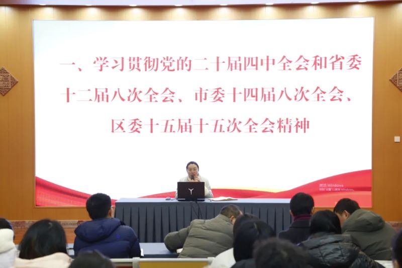 首先,第一党支部书记徐雪琴同志带领全体党员集中学习了市委十四届八次全会及区委十五届十五次全会精神,引导全体党员精准领会党的二十届四中全会精神、“十五五”时期发展目标与任务的核心要义,主动将工作融入区域发展大局,自觉争做教育事业的“担当者”“实践者”和“服务者”。